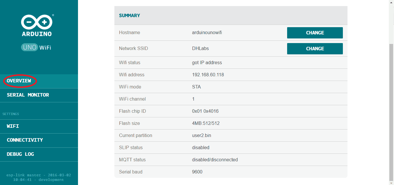 In the Overview is shown all the information about the configuration board: the hostname, the network SSID, Wifi address, Wifi mode and other details