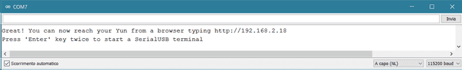 The selection of the AP triggers the connection process and the Yún Shield will sense if the network is open or protected. In this later case, you will be asked to provide the key. The board needs to be named and protected with a password to allow easy and secure connections. Following these step, your shield is ready to connect to the WiFi network, switching off the AP mode and initiating the access to the selected WiFi network. At the end of this process, the sketch will show the IP address obtained from the WiFi DHCP server.